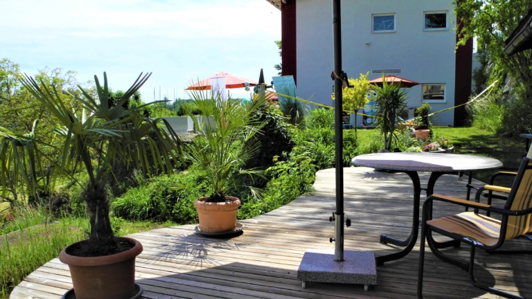 Ambiente: Ausblick durch eine großzügige Glasfront 3x12 Meter mit Außenjalousien in unseren Palmengarten. Unser Palmengarten mit Terrasse ist sehr beliebt, er löst ein Urlaubsflair aus, ein Ort zum Wohlfühlen und Entspannen.